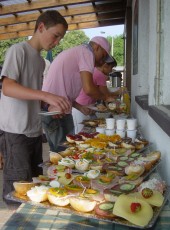 Frühstücksbuffet! Christin Herre und ihr Team vom "Paddlertreff" in Mihla verpflegten uns alle Tage des Lagers morgens, mittags und abends mit tollen Köstlichkeiten. Die Teilnehmer waren sich einig: So eine gigantische Vier-Sterne-Verköstigung hat es noch bei keinem Jugendlager gegeben! |
